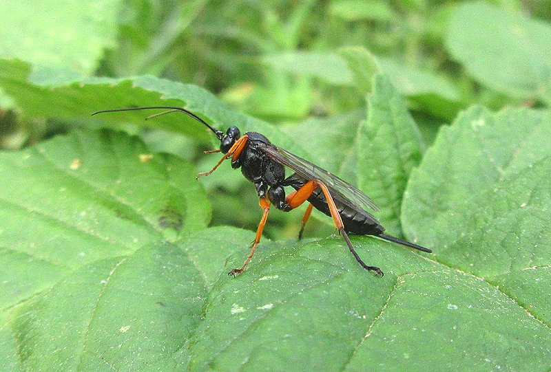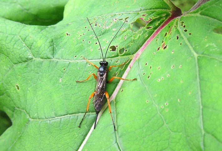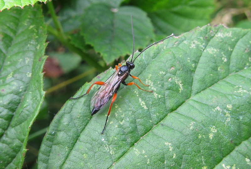 Body length 10 - 15mm. A black ichneumon with bright orange legs. The female's ovipositor is short and thick. Apechthis compunctor is very similar but the ovipositor has a downward curve at the end. Males are indistinguishable from each other from photographs.