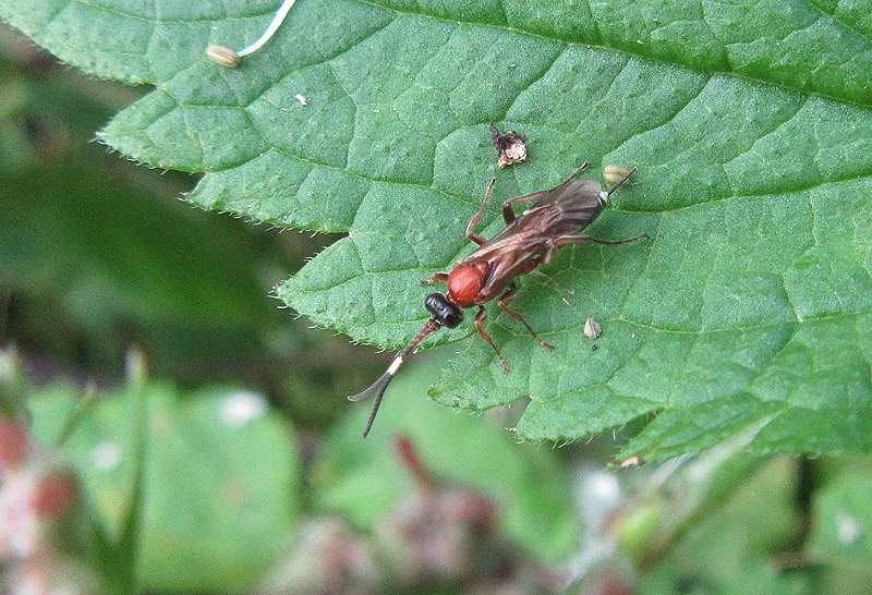 Body length 9 - 11mm. Black and orange/brown with white on the tip of the abdomen and white bands on the antennae.