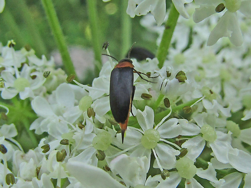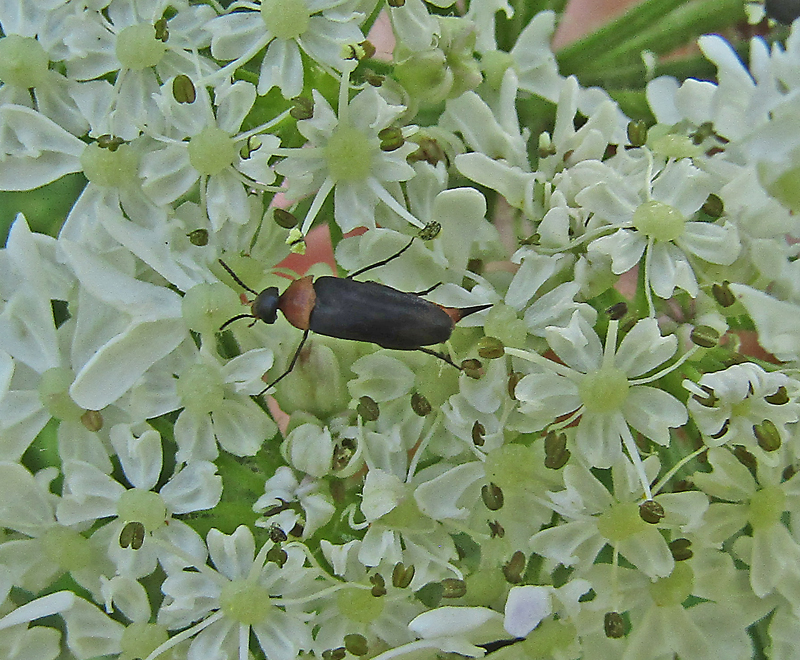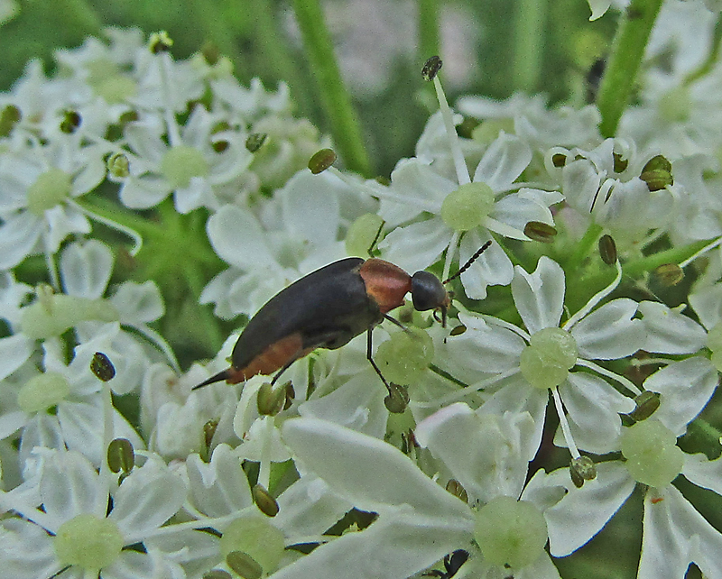 Over all length 4.5 to 6.5mm. The elytra and head are dark, grey to black, and the abdomen and pronotum are orange/tan. In the male the pronotum is blackish, sometimes with some orange at the base.