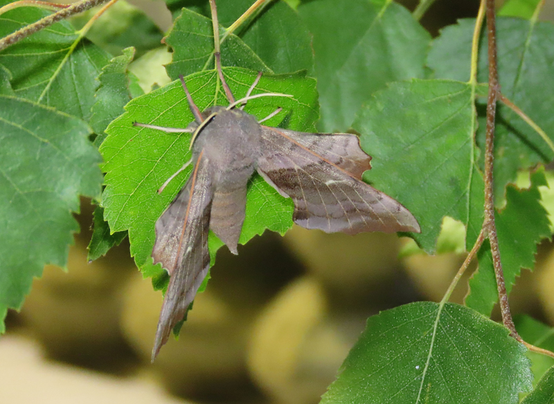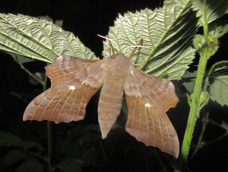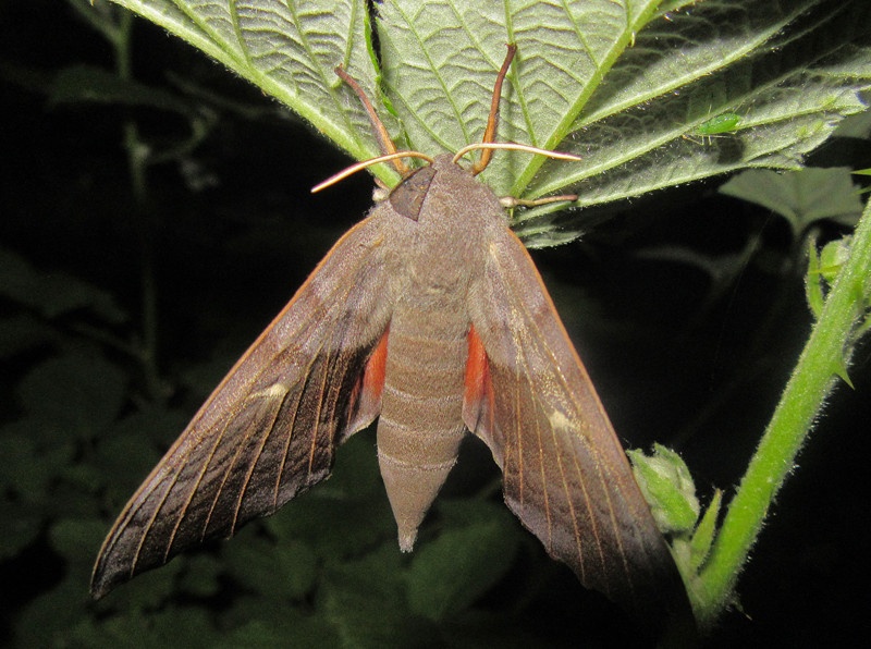 Wingspan 72 - 92mm. Mostly greys and browns, the hind-wings have a large reddish/chestnut patch and are often held well in front of the fore-wings.