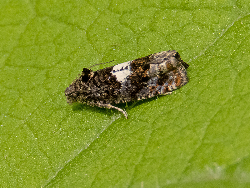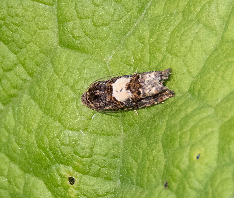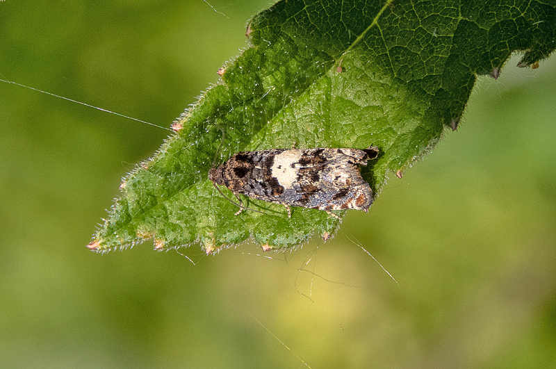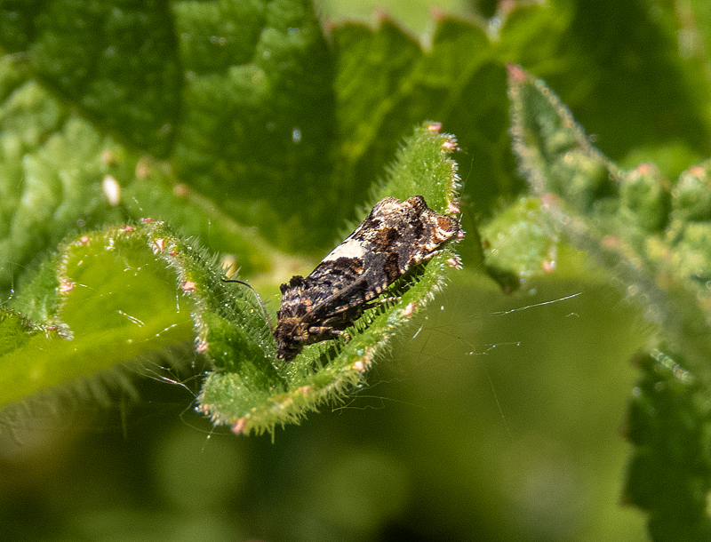 Wingspan 12 to 20mm (E. cirsiana), 18 to 23mm (E. scutulana). These two species are very difficult to separate, so the photograph shows one or the other. The wings are marked with browns, black and a lavender blue and there is a large white patch near the centre of the hind edge of the fore-wing.