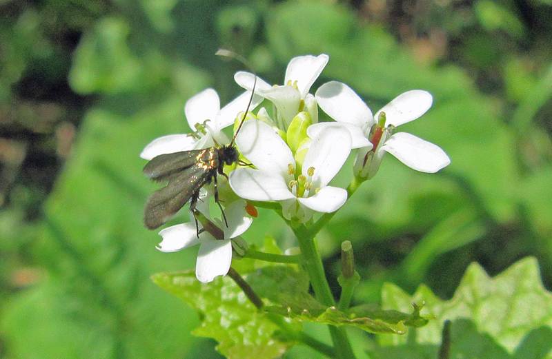Wingspan 11mm. A brassy longhorn with long antennae that are black going to white towards the distal half. The male's antennae are only slightly longer than the female's and nowhere near as long as those of Adela reaumurella.