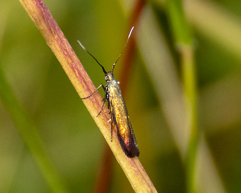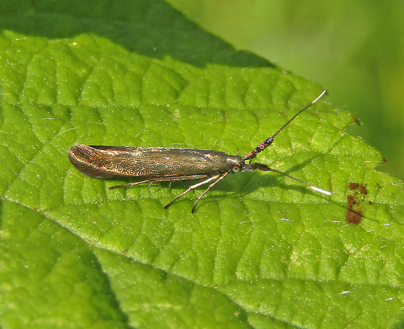 Wingspan 11mm. The wings are a metallic bronze. The antennae are flattened at the base and have long white tips. There are three other similar species.