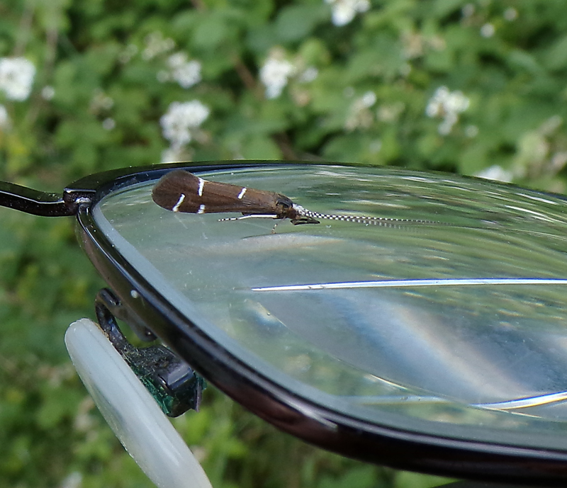 Forewing 8 to 10mm. The forewings are brown with four short white marks. The legs are mainly white and the antennae white ringed with black.